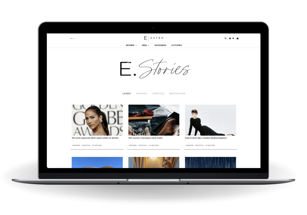 Estro Luxury Designer Outlet is an established Australian business with a strong online presence and two brick-and-mortar stores. We incorporated the vibe & feel of Estro into each one of the E.Stories articles so the voice would be personal, inspiring, and atmospheric but still sales-focused. This approach has drawn in clients ready to invest in luxury fashion and formed a strong connection between the brand and the readers.